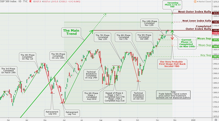 The trading session started with all of the large-cap indices delivering intraday session highs, notwithstanding the adverse sentiment in the retail space. The initial market advance immediately faltered although overall losses were moderate, and temporary, as the S&P 500 index declined only 0.3% beneath its Outer Index Rally $3,125 line before bulls promptly hopped in to buy the decline.
